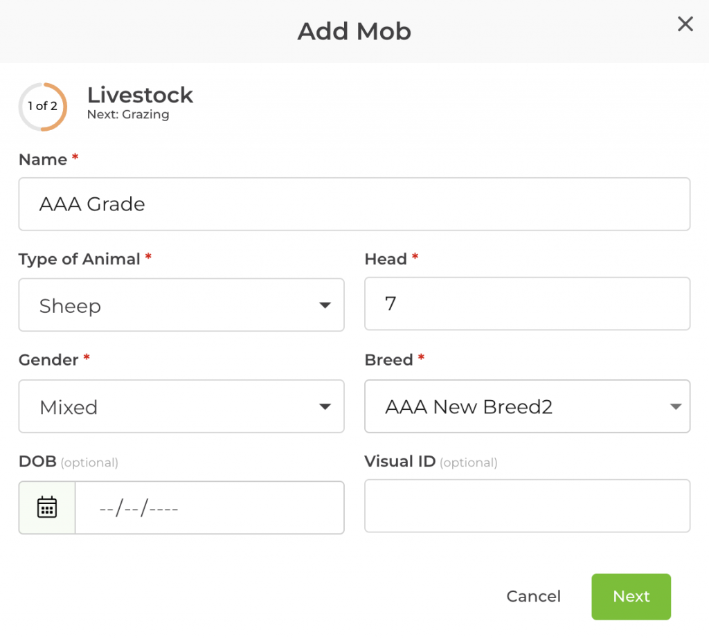 Step 3: A pop-up box will open where you can fill in your livestock information. Click the green Next button once you have filled in all the information.