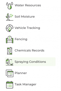 Step 1: Navigate to the main menu on the left-hand side of the page. Scroll down and click on the Spraying Conditions button.