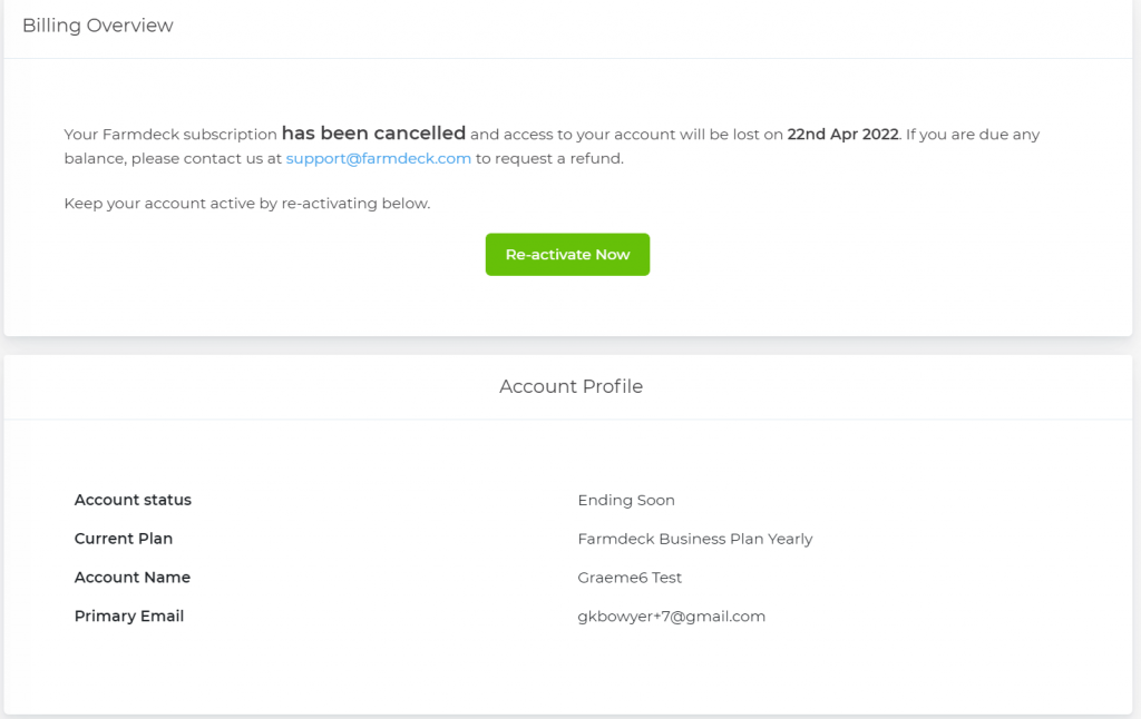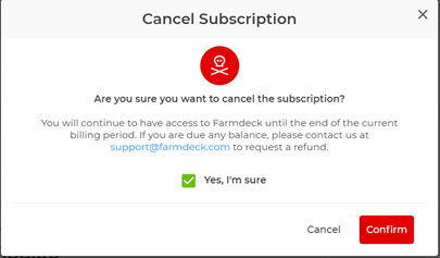 Step 6: Once your subscription has been cancelled, you will still have access to Farmdeck until the end of your current billing period (this date will be displayed).
