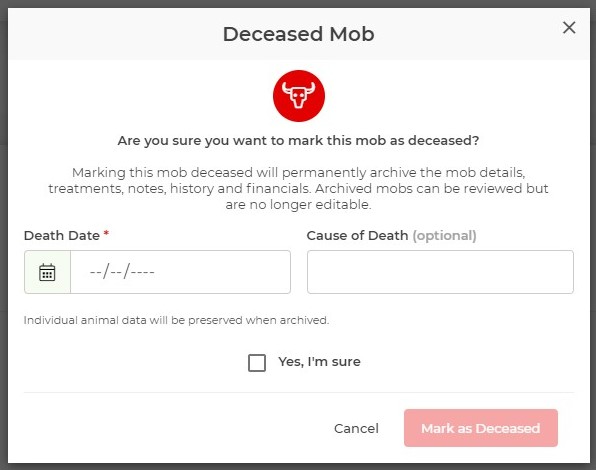 Step 5: After you have filled in the details, tick the Yes, I’m sure box and click Mark as Deceased to finalise recording the death of this mob.
