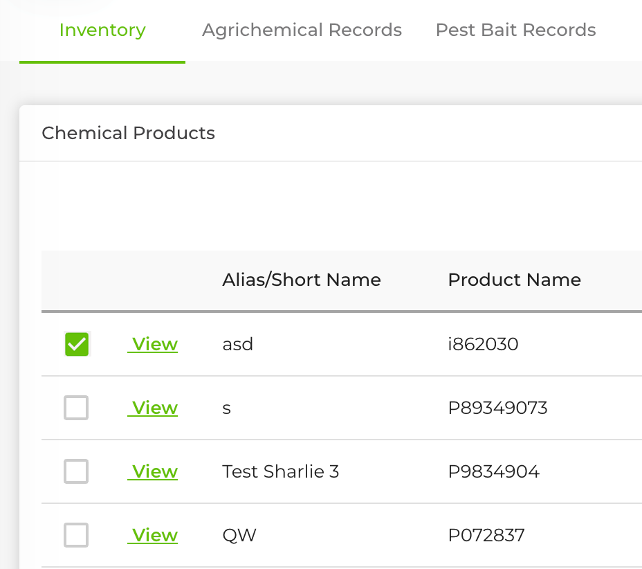 Step 2: Once your main page opens, you will automatically be on the Inventory tab where you will see an overview of all your chemical records. Click the box on the left-hand side of the chemical record that you want to delete.