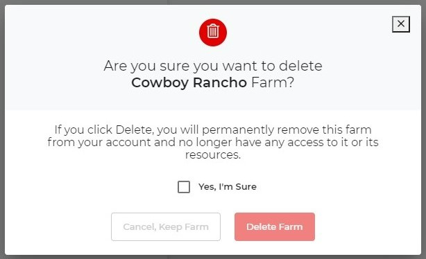 Please keep in mind that if you click Delete, you will remove the farm and all its data from your account permanently.